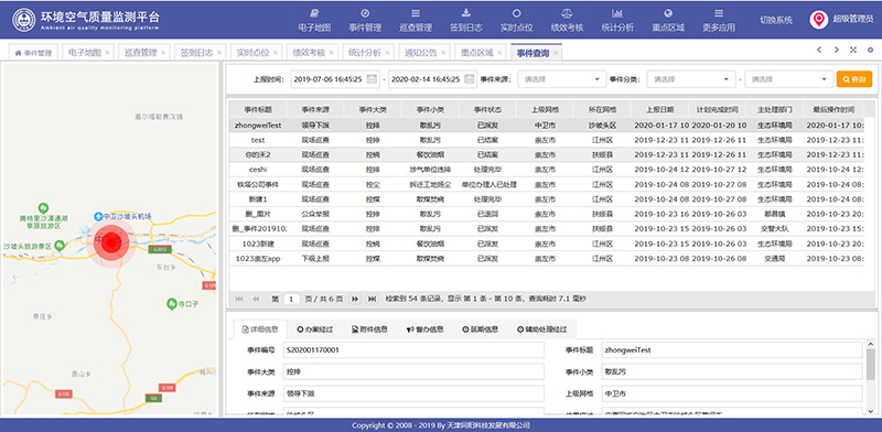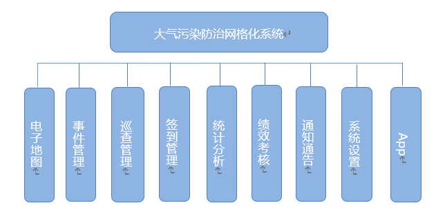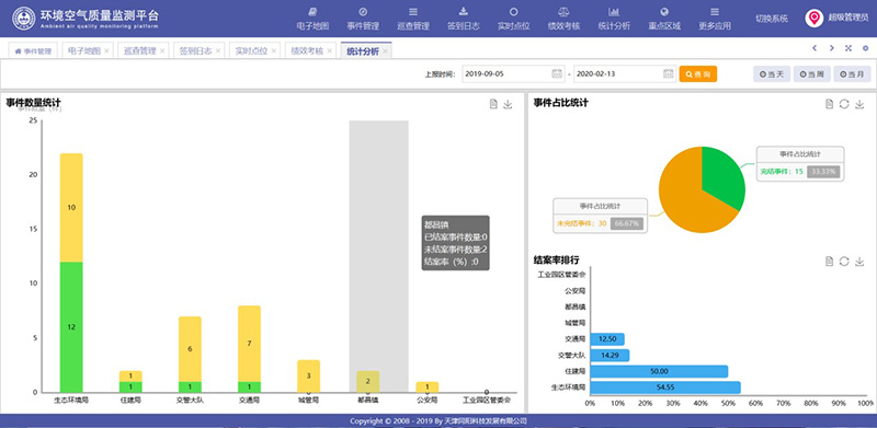 系統(tǒng)的主要功能模塊包括:電子地圖、事件管理、巡查管理、設(shè)備報(bào)警、簽到日志、實(shí)時(shí)點(diǎn)位、統(tǒng)計(jì)分析、績(jī)效考核、通知公告、重點(diǎn)區(qū)域、事件查詢、系統(tǒng)管理。