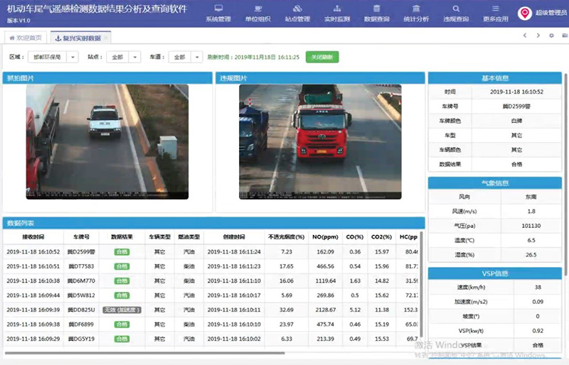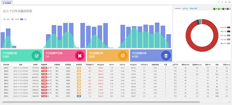 尾氣遙感檢測平臺實現(xiàn)了對機(jī)動車尾氣數(shù)據(jù)的采集、管理維護(hù)功能??梢詫崟r查詢固定式站點監(jiān)測數(shù)據(jù)及移動式站點監(jiān)測數(shù)據(jù)。所監(jiān)測的數(shù)據(jù)信息涵蓋了機(jī)動車尾氣檢測參數(shù)值、氣象參數(shù)數(shù)據(jù)、環(huán)境空氣質(zhì)量數(shù)據(jù)、黑煙車數(shù)據(jù)等。同時結(jié)合環(huán)境空氣質(zhì)量數(shù)據(jù)與尾氣檢測數(shù)據(jù)進(jìn)行統(tǒng)計分析,并與交管局、車管所進(jìn)行數(shù)據(jù)庫對接。形成了實時查詢和匹配車輛基本信息于一體的數(shù)據(jù)檢測、統(tǒng)計、分析系統(tǒng)。