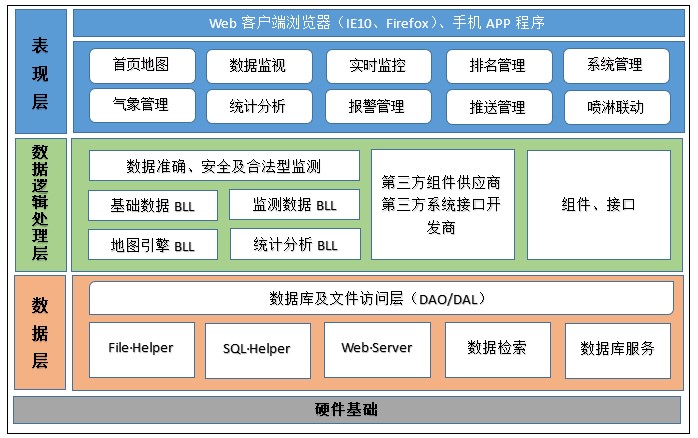 系統(tǒng)的主要功能模塊包括:電子地圖、實(shí)時監(jiān)控、數(shù)據(jù)查詢、報警管理、站點(diǎn)排名、統(tǒng)計分析、網(wǎng)絡(luò)監(jiān)控、噴淋聯(lián)動、系統(tǒng)管理、運(yùn)維管理。