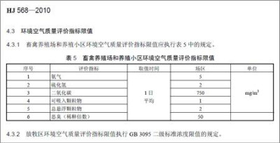 2010年,由生態(tài)環(huán)境部發(fā)布的《畜禽養(yǎng)殖產(chǎn)地環(huán)境評(píng)價(jià)規(guī)范》,明確了畜禽養(yǎng)殖場(chǎng)和養(yǎng)殖小區(qū)環(huán)境空氣質(zhì)量評(píng)價(jià)指標(biāo)限值。